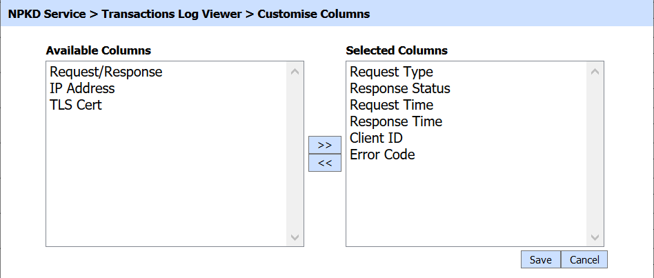 Clicking on the Customize Columns button on Certification Transactions Log Viewer displays following screen: