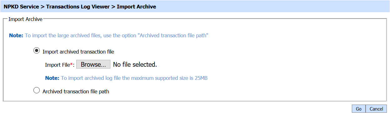 The NPKD Service transaction records can be sorted in either ascending or descending order by selecting a table column from the drop down list. From the drop down menu in above screen, choose Import Archived and click on Go button. This will show the following screen: