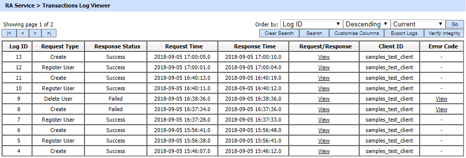This helps to locate a particular type of RA service transaction. The transaction can be searched based on Log ID, Client ID, Request Type, Response Status, Request Time, Response Time. If a search is based on multiple values, then these will be combined together using the “AND” operand, and thus only records that meet all the criteria will be presented.