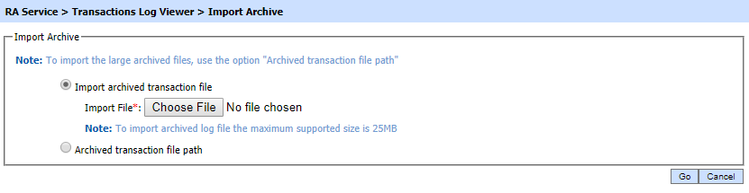 The RA Service transaction records can be sorted in either ascending or descending order by selecting a table column from the drop down list. From the drop down menu in above screen, choose Import Archived and click on Go button. This will show the following screen: