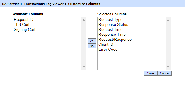 Clicking on the Customise Columns button on RA Transactions Log Viewer displays following screen: