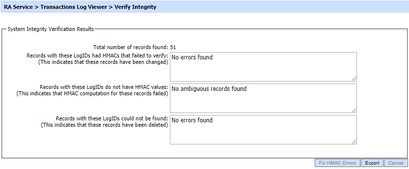 Verifies the integrity of the RA service transaction log records. It detects tampered records and generates a report that can be exported to a physical drive. When exporting HMAC verification reports, it is recommended to save the file with “.html” extension so that the report can be viewed in an internet browser