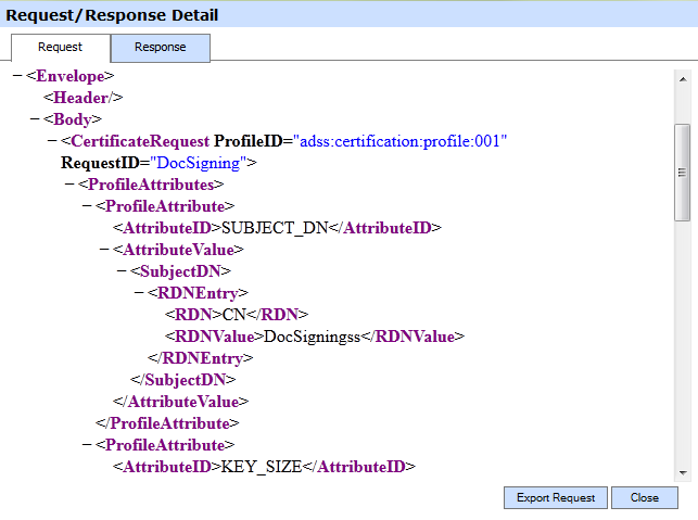 Clicking on View link under the request/response column for an XML request shows the XML request and response for the selected signing transaction in different tabs: