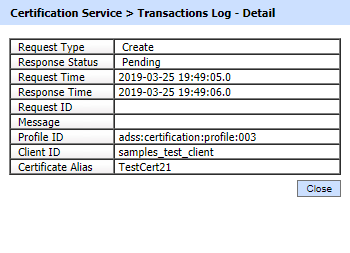 Clicking on “View” link under this column displays the request signing certificate. The “View” link is only present when a signed request was sent to the certification service. |