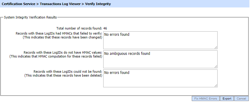 Verifies the integrity of the certification service transaction log records. It detects tampered and deleted records and generates a report that can be exported to a physical drive. |