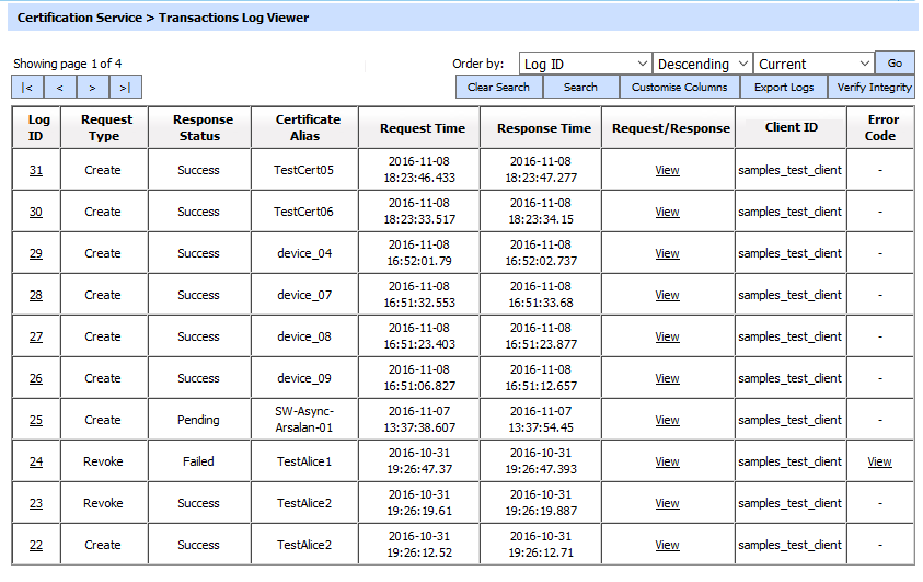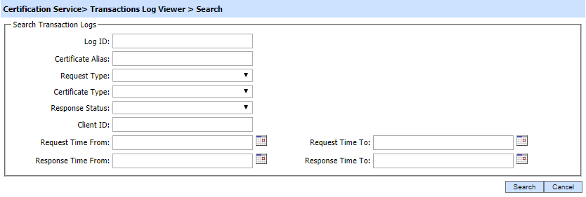 This helps to locate a particular type of certification service transaction. The transaction can be searched based on "Log ID", "Certificate Alias", "Request Type", "Certificate Type", "Response Status", "Client ID", "Request Time From", "Request Time To", "Response Time From" and "Response Time To". If a search is based on multiple values, then these will be combined together using the “AND” operand, and thus only records that meet all the criteria will be presented.