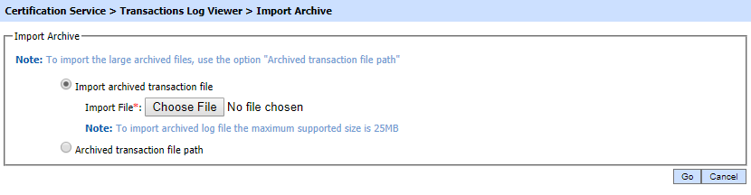 The Certification Service transaction records can be sorted in either ascending or descending order by selecting a table column from the drop down list. From the drop down menu in above screen, choose Import Archived and click on Go button. This will show the following screen: