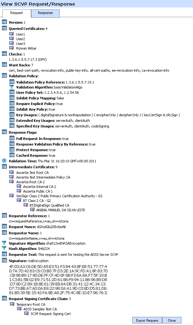 Click on the Export Request/Export Response button to export the SCVP request/response on the physical drive.