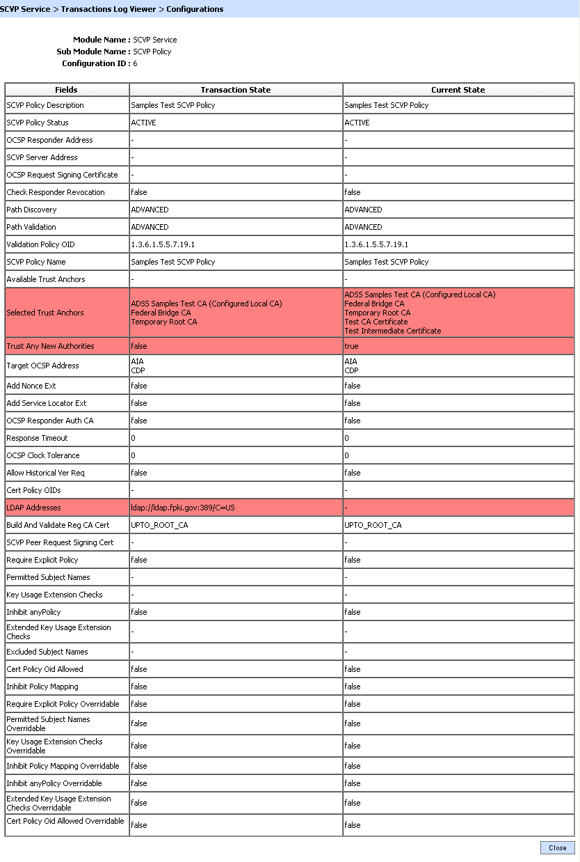 - In transaction log viewer a link is shown to launch the validation policy configuration used to process the particular request. When user clicks on this link, a database query made to validation policy history table and the validation policy state is shown in a generic viewer with Transaction State and Current State.