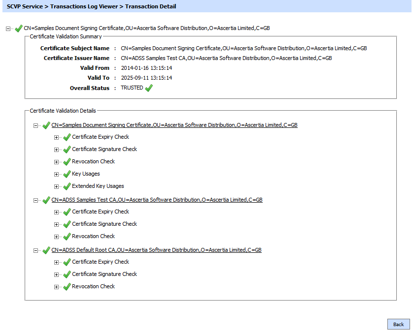 Clicking on “View” link under this column displays the request signing certificate. The “View” link is only present when a signed request was sent to the SCVP service. |