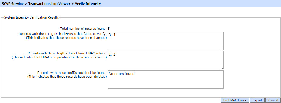 Verifies the integrity of the SCVP service transaction log records. It detects tampered and deleted records and generates a report that can be exported to a physical drive. When exporting HMAC verification reports, it is recommended to save the file with “.html” extension so that the report can be viewed in an internet browser. |