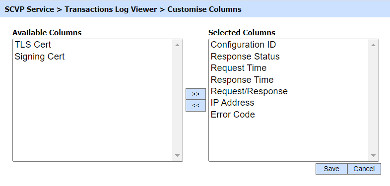 Clicking on the Customise Columns button on SCVP Transactions Log Viewer displays following screen: