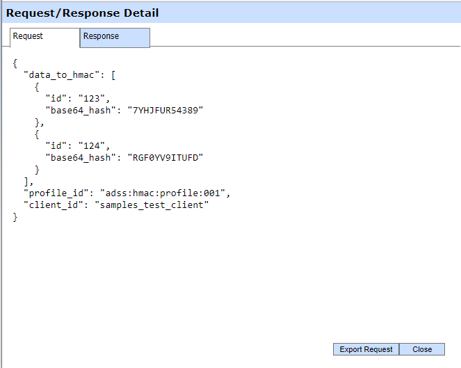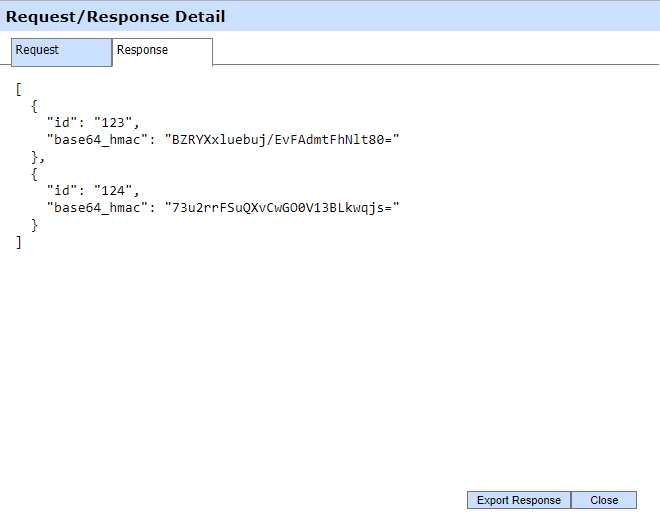 Clicking on the View link for Request/Response displays the request and response for the selected HMAC transaction in different tabs: