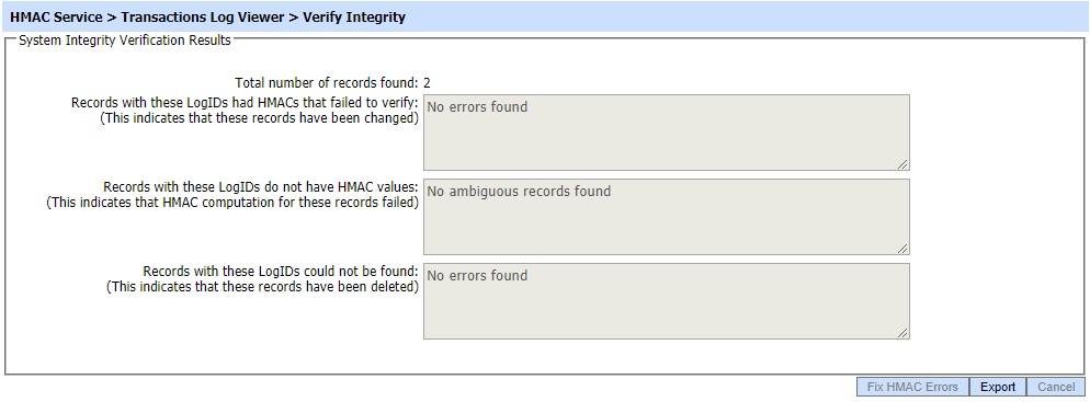 Verifies the integrity of the HMAC service transaction log records. It detects tampered and deleted records and generates a report that can be exported to a physical drive. Note: When exporting HMAC verification reports, it is recommended to save the file with “.html” extension so that the report can be viewed in an internet browser. |