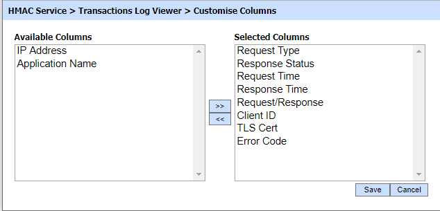Clicking on the Customise Columns button on HMAC Transactions Log Viewer displays following screen: