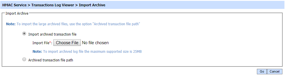 The HMAC Service transaction records can be sorted in either ascending or descending order by selecting a table column from the drop down list. From the drop down menu in above screen, choose Import Archived and click on Go button. This will show the following screen: