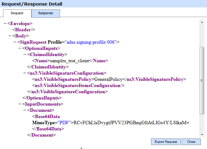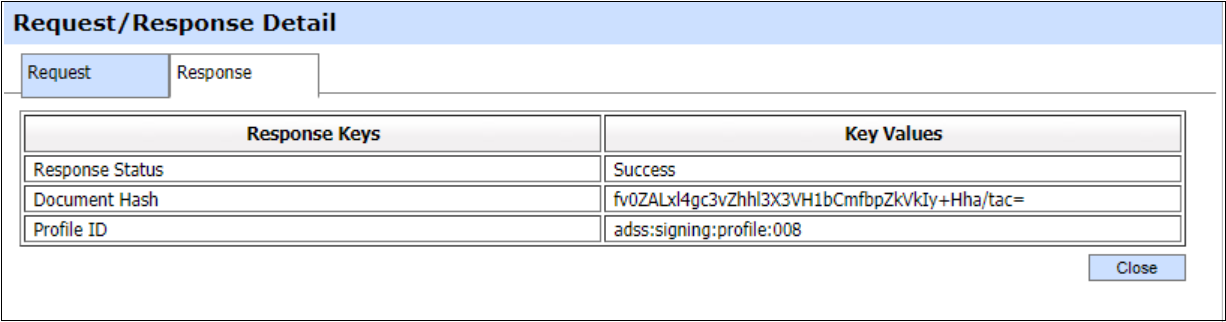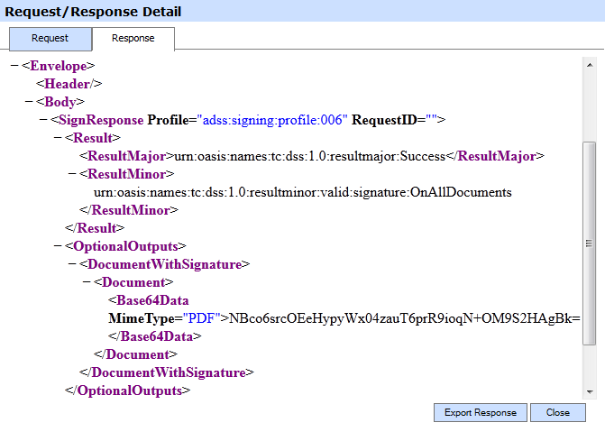 Clicking on View link under the request/response column for an XML request shows the XML request and response for the selected signing transaction in different tabs: