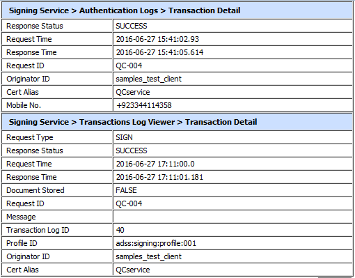 The ADSS Signing Service keep record of every request and corresponding response made to the service in the transactions log for auditing purpose. Each item in the image is described below: