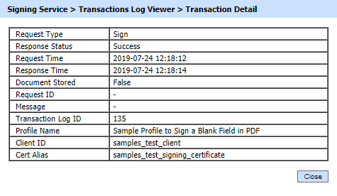 Clicking on “View” link under this column displays the request signing certificate. The “View” link is only present when a signed request was sent to the certification service. |