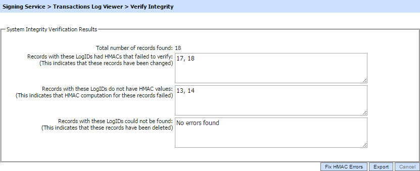 Verifies the integrity of the RA service transaction log records. It detects tampered records and generates a report that can be exported to a physical drive. When exporting HMAC verification reports, it is recommended to save the file with “.html” extension so that the report can be viewed in an internet browser |