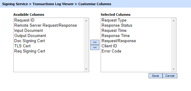 Clicking on the Customise Columns button on Signing Transactions Log Viewer displays following screen:
