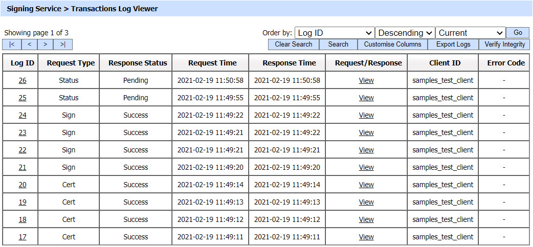 As explained above, clicking on the Search button on Signing Transactions Log Viewer displays following screen: