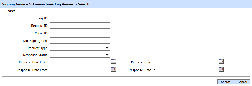 This helps to locate a particular type of signing service transaction. The transaction can be searched based on "Request ID", "Client ID", "Doc Signing Cert", "Request Type", "Response Status", "Request Time From", "Request Time To", "Response Time From" and "Response Time To". If a search is based on multiple values, then these will be combined together using the “AND” operand, and thus only records that meet all the criteria will be presented.