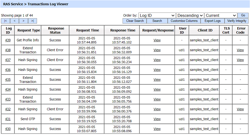 The RAS Service keeps a secure audit record of every request made and every response given within the ADSS Server database. These records can be viewed by using the transactions log viewer.