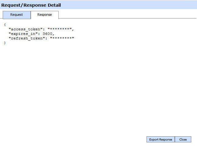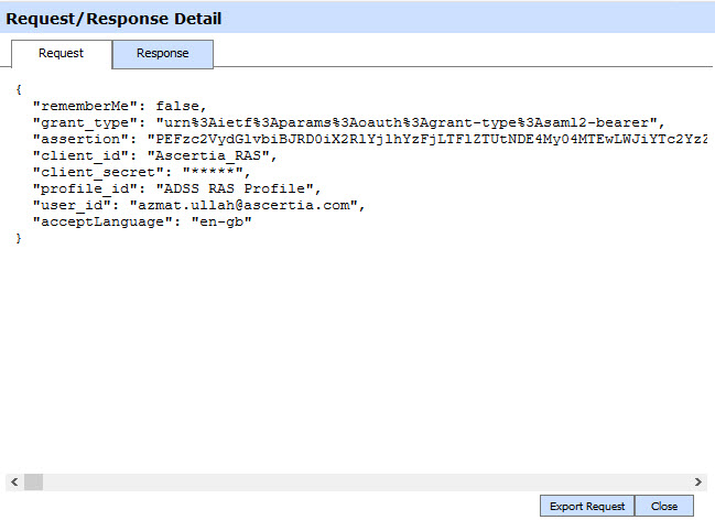 Clicking the View link under the request/response column shows the JSON request and response for the selected RAS transaction in different tabs: