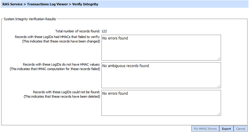 This button verifies the integrity of the RAS service transaction log records. It detects tampered or deleted records and generates a report that can be exported to a physical drive.