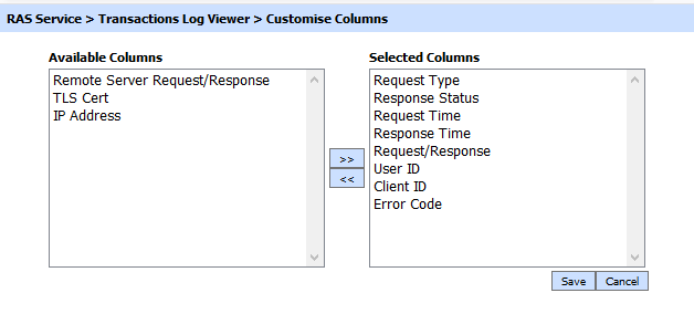 Clicking the Customise Columns button on Transactions Log Viewer displays the following screen:
