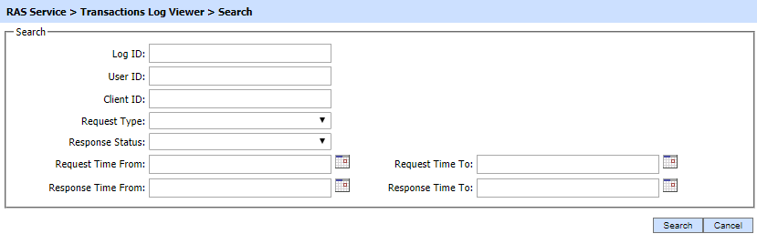 This helps to locate a particular SAM Service transaction. The transactions can be searched based on their "Log ID", "User ID", "Client ID", "Request Type", "Response Status", "Request Time From", "Request Time To", "Response Time From" and "Response Time To". If a search is based on multiple values, then these will be combined together using the “AND” operand, and thus only records that meet all the criteria will be presented.