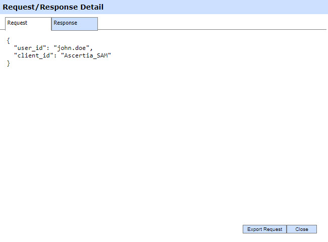 Clicking on View link under the request/response column shows the JSON request and response for the selected SAM transaction in different tabs: