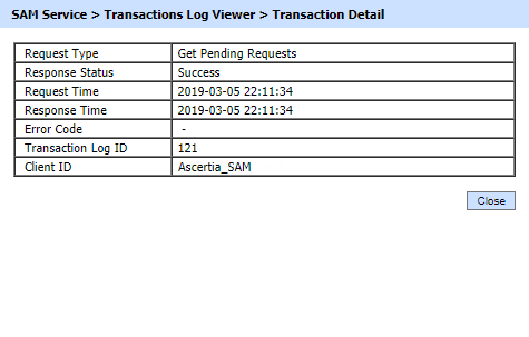 The ADSS SAM Service keep record of every request and corresponding response made to the service in the transactions log for auditing purpose. Each item in the image is described below: