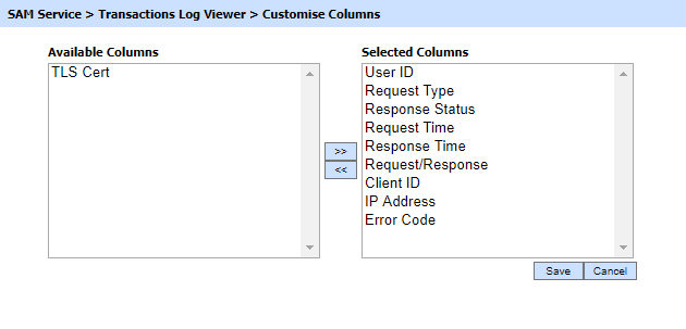 Clicking on the Customise Columns button on SAM Transactions Log Viewer displays following screen: