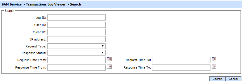 This helps to locate a particular type of SAM service transaction. The transaction can be searched based on "Log ID", "User ID", "Client ID", "IP Address", "Request Type", "Response Status", "Request Time From", "Request Time To", "Response Time From" and "Response Time To". If a search is based on multiple values, then these will be combined together using the “AND” operand, and thus only records that meet all the criteria will be presented.