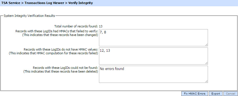 Verifies the integrity of the TSA service transaction log records. It detects tampered and deleted records and generates a report that can be exported to a physical drive. Note: When exporting HMAC verification reports, it is recommended to save the file with “.html” extension so that the report can be viewed in an internet browser. |