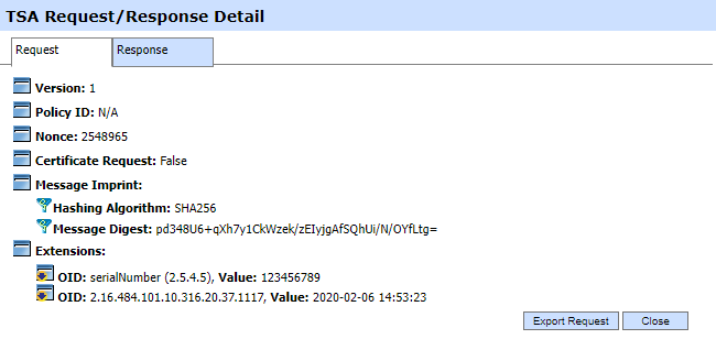 Clicking on the View link for Request/Response displays the timestamp request and response for the selected TSA transaction in different tab.