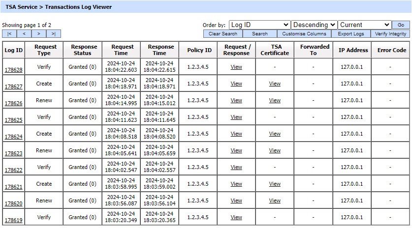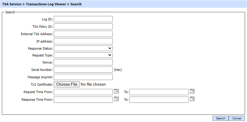 This helps to locate a particular time stamp the TSA service may have issued within a particular time-frame or to a particular client (i.e. IP address). If a search is based on multiple values, then these will be combined together using the “AND” operand, and thus only records that meet all the criteria will be presented.