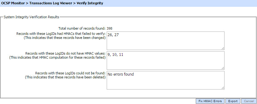 Verifies the integrity of the service transaction log records. It detects tampered and deleted records and generates a report that can be exported to a physical drive. When exporting the HMAC verification report, it is recommended to save the file with “.html” extension so that the report can be viewed in an internet browser. |