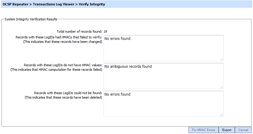 Verifies the integrity of the signing service transaction log records. It detects tampered and deleted records and generates a report that can be exported to a physical drive. Note: When exporting HMAC verification reports, it is recommended to save the file with “.html” extension so that the report can be viewed in an internet browser. |