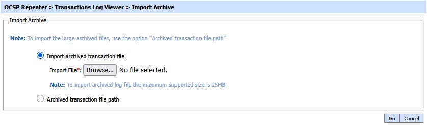 The OCSP Repeater Service transaction records can be sorted in either ascending or descending order by selecting a table column from the drop down list. From the drop down menu in above screen, choose Import Archived and click on Go button. This will show the following screen: