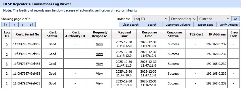 The OCSP Repeater Service Transaction Log Viewer provides a record of each request made to the OCSP Repeater Service and each response returned by the service: