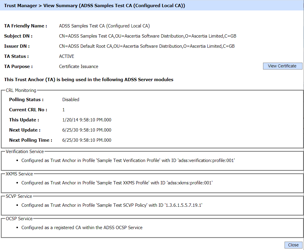 The ADSS Server Trust Manager module is used to register all trusted Trust Authorities (TAs). When verifying signed objects it must be possible to build a certificate chain from the signer’s certificate to one of the trusted authorities registered in the Trust Manager in order for the signature to be considered valid.