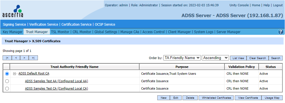 To launch the Trust Manager click on the relevant tab as shown below. A table will be displayed showing the current list of known Trusted Authorities. Trust anchors can be added and existing ones can be edited and deleted as required by a suitably authorised operator.