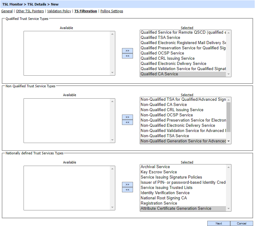 Here the operator can configure the Trust Services types according to its requirement for the required TSL.