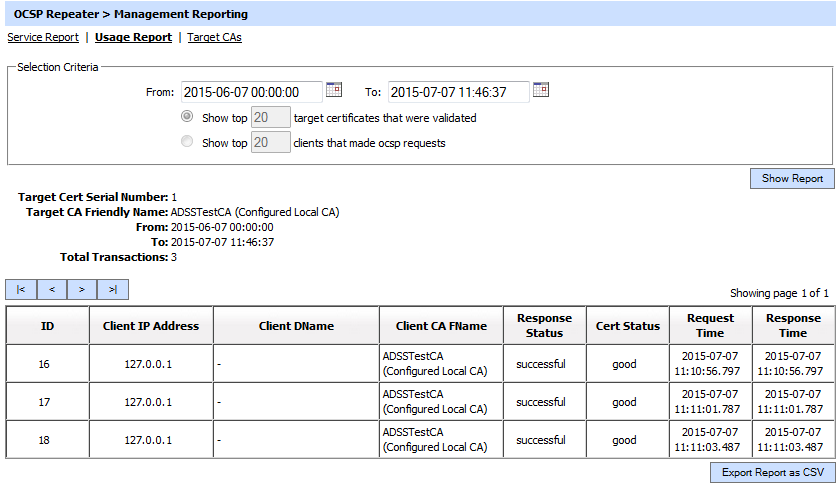 First select the date range for your report. Then select whether to report on target certificates or on clients. Then press the Show Report button. The table will be refreshed with the configured details. This report can be exported as a zipped CSV file.