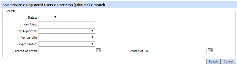 This helps to search a particular User Key of a registered user. The User Keys can be searched based on their Status, Key Alias, Algorithm, Key Length, Crypto Profile, Created At From and Created At To. If a search is based on multiple values, then these will be combined together using the “AND” operand, and thus only records that meet all the criteria will be presented.