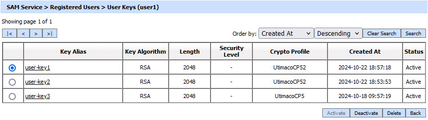 You can either Activate, Deactivate or Delete a selected User Key. Clicking on the Key Alias will show the user certificate.