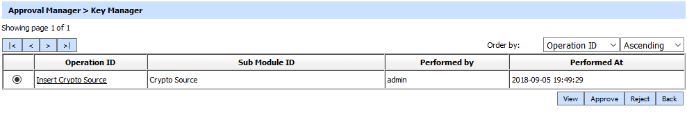 Pending operations for a selected ADSS module can be sorted in either Ascending or Descending order by selecting a table column from the drop down list. The list can be sorted by "Operation ID", "Sub Module ID", "Performed At" and "Performed By". The table lists all pending operations in that module. By default the pending operations will be shown in date order with most recent first.